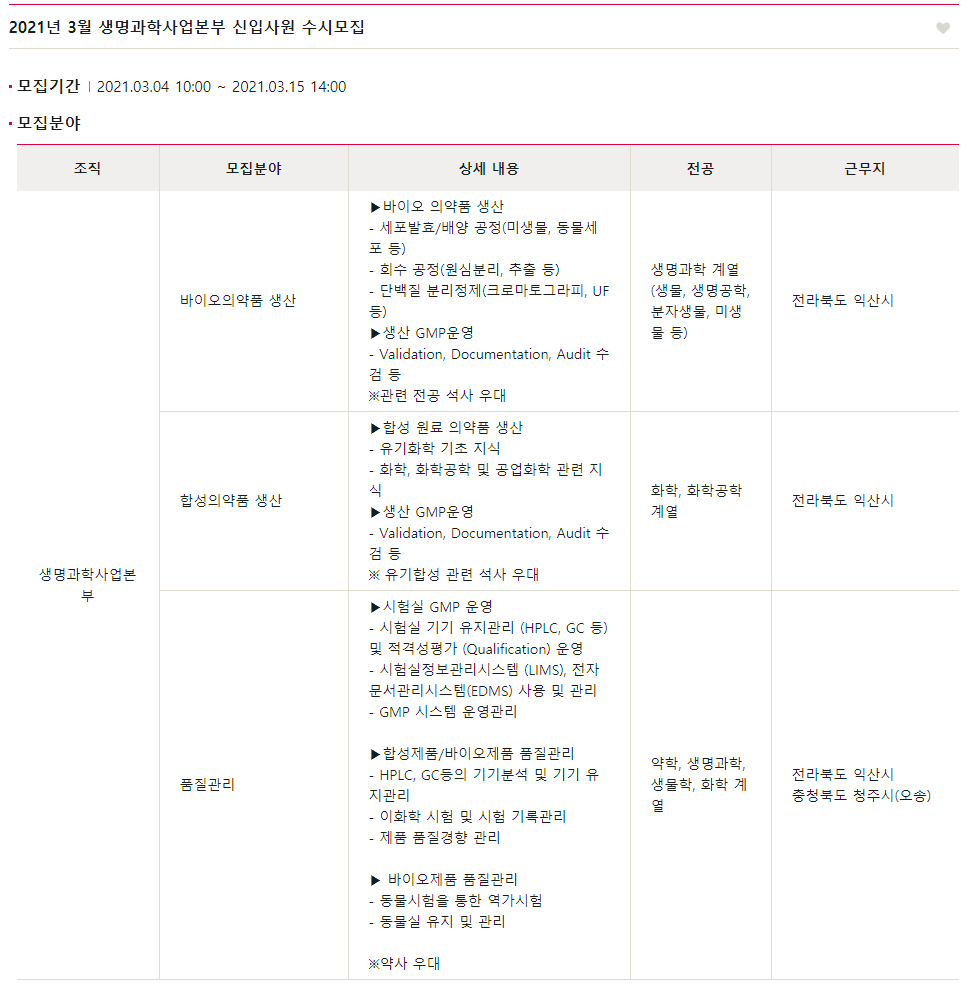 취업준비생이라면 누구나 좋은 복리후생, 높은 연봉을 가진 기업을 원할 것입니다.대기업의 경우 연봉과 복지 등 여건이 우수하기 때문에 많은 취업준비생들이 도전하고 있습니다. 오늘은 대기업 중 LG그룹 채용공고에 대해 알아보겠습니다.LG화학은 글로벌 경쟁력을 갖춘 석유화학, 첨산소재, 생명과학사업 및 배터리 전문 자회사 등으로 세계적인 기업이 되고자 합니다.생명과학사업본부 신입사원을 모집하고 있으니 기업에 대해 좀 더 알아봅시다.